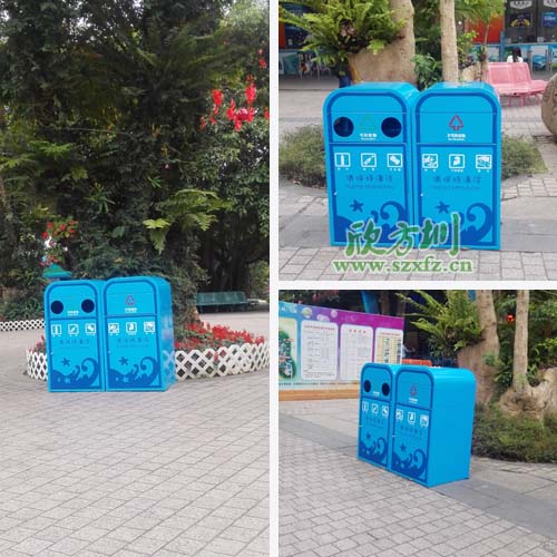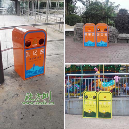 欣方圳鋼制鍍鋅烤漆垃圾桶在華僑城游樂園站崗