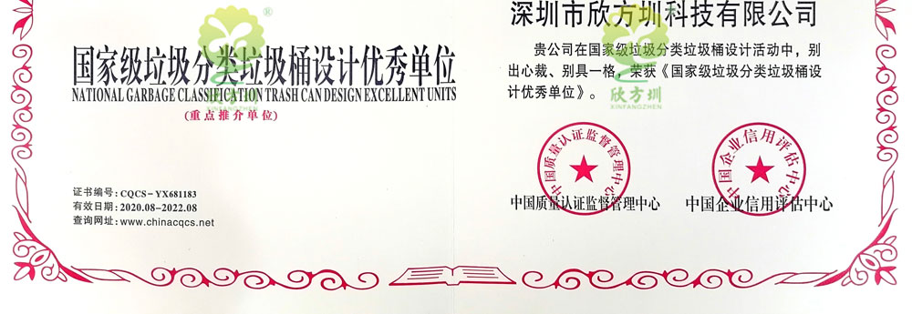 欣方圳獲得國家級垃圾分類垃圾桶設計優秀單位,知識產權管理體系認證,信息安全管理體系認證,物聯網高新技術垃圾桶系統計算機軟件著作權:基于物聯網技術的垃圾分類處理設備控制系統軟件、遠程監測系統軟件、環境監測系統、智能管理系統平臺軟件