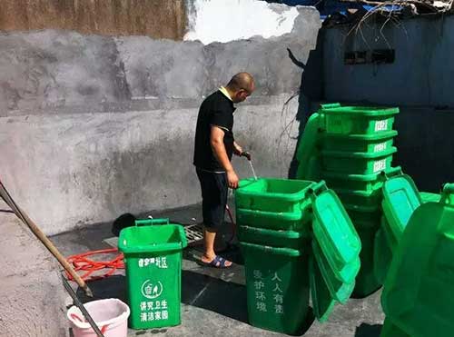 前天上午8點,金棉小區廢棄籃球場的東南角就響起了一陣陣沖洗聲,清潔人員劉師傅拿著水管沖洗著一只只垃圾桶,邊上一排晾著幾十只剛洗干凈的垃圾桶。這些垃圾桶都是早上從小區里收集來的,洗干凈晾干后,第二天去替換其他臟的垃圾桶。